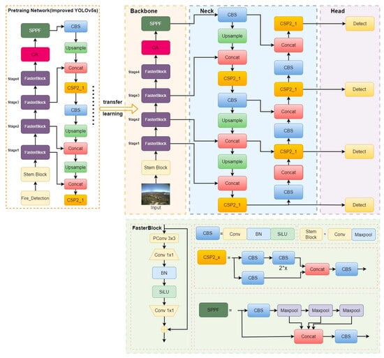 We amalgamated the backbone design, the detection head specialized for small-scale smoke, and the CA module into the YOLOv5s model, thus creating an enhanced version known as the improved YOLOv5s. The whole process of forest fire smoke detection, namely, the improved YOLOv5 model, through the utilization of transfer learning, is visually depicted in Figure 7.