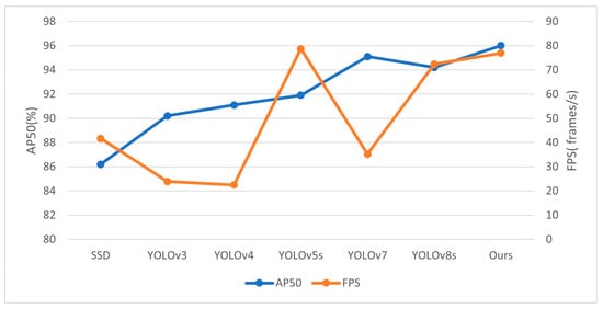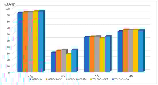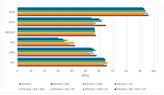 - The results of the controlled experiments on different backbone architectures show that, by employing our custom-designed backbone, the model’s parameters were reduced from 6.11 M to 6.02 M, GFLOPS decreased from 15.8 to 12.8, and the image detection time was diminished from 12.7 ms to 12.3 ms, with the FPS increasing from 78.7 to 81.3. Moreover, relative to the CSPDarknet53 of the original YOLOv5s, our backbone network model achieved enhancements of 0.9, 3.6, 1.5, and 1.2 percentage points in the evaluation metrics , , , and , respectively. Our designed backbone not only elevated the AP metrics, but also compacted the model size and expedited processing speed.