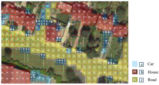 As shown in Figure 2, the collection of sample data is marked by taking the grid as the unit, which can be completed quickly by directly selecting the type of the ground object (i.e., car, house, or road) in the grid sample, and the corresponding label set is . However, when labeling samples using a grid as the unit, it is often impossible for a certain type of ground object to occupy a complete grid; in particular, the ground object may occupy only a small part of the grid, or the ground object may occur in the middle line of two adjacent grids, such as the grid indicated by the white arrow in Figure 2. This issue poses a significant challenge to the accuracy of sample data.