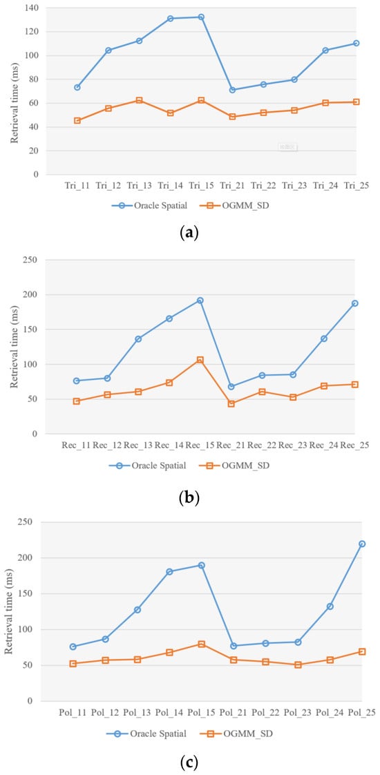This study retrieved the RS_CDS (RS_CDGS) of the triangular research areas, rectangular research areas, and polygonal research areas. A comparison of the Oracle Spatial retrieval time and OGMM_SD retrieval time in the research areas is shown in Figure 8. The retrieval time was taken as the average of the three queries under the same conditions.
