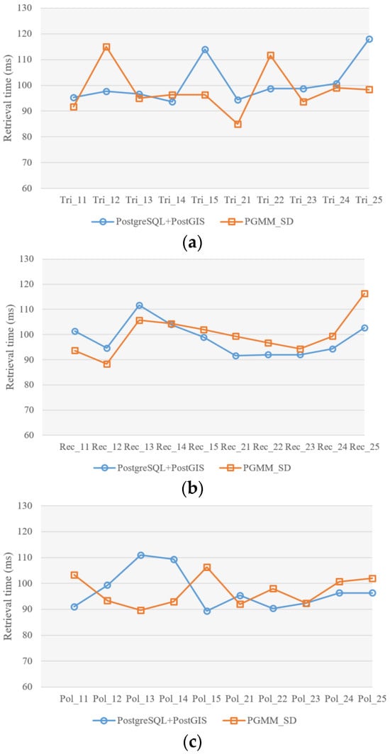 Comparison of PostgreSQL retrieval time: (a) comparison of PostgreSQL retrieval time in triangular research areas; (b) comparison of PostgreSQL retrieval time in rectangular research areas; (c) comparison of PostgreSQL retrieval time in polygonal research areas.