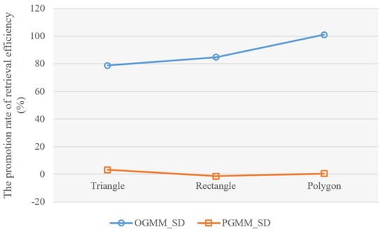 As shown in Table 3 and Figure 10, PGMM_SD increased by 3.26% in the triangular research areas, decreased by 1.40% in the rectangular research areas, and increased by 0.58% in the polygonal research areas, and the total average for the RS_CDS was 0.81%. Moreover, the overall RS_CDS retrieval efficiency of PGMM_SD was slightly improved compared with that of PostgreSQL + PostGIS.