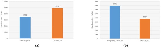 Database capacity comparison: (a) comparison of database capacity between Oracle Spatial and OGMM_SD; and (b) comparison of database capacity between PostgreSQL + PostGIS and PGMM_SD.