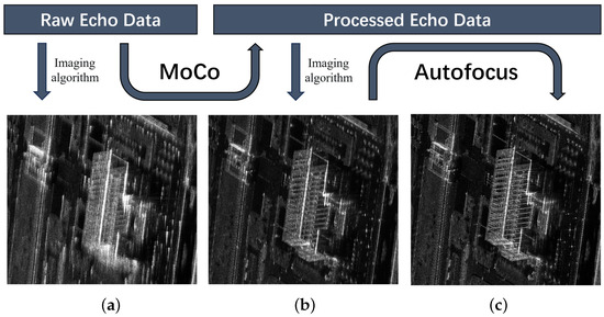 Thus, phase errors are added in azimuth and distance direction, causing defocusing, distortion, and other phenomena affecting image quality [3,4]. Flight trajectory and attitude data provided by INS and GNSS are usually used for motion compensation [5,6] to eliminate serious errors. However, due to the limitation of the accuracy of the inertial data and vibration of the load itself, motion compensation cannot eliminate all errors. In order to solve this problem, it is necessary to use autofocus technology; that is, to use the characteristics of echo data itself for motion error compensation so that the image can be further focused [7]. Figure 1 shows where motion compensation (MoCo) [8] and autofocus technology are typically used, and to what extent they improve image quality.