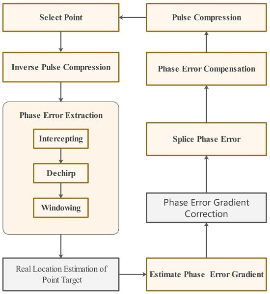 (2) Non-parametric autofocus method: The non-parametric method does not require a parametric model of the motion error because it extracts the phase or phase gradient of the motion error directly from the raw radar data. Its main representative algorithm is the Phase Gradient Algorithms (PGA) [19,20,21], which does not depend on the specific model and can estimate the phase error from the characteristics of the data itself. Theoretically, the phase error of the second order or any order above can be estimated through iteration. Because of this advantage, various improved algorithms based on it have been widely studied in recent years, but there are still some problems that have not been overcome. For example, the Stripmap Phase Gradient Method (SPGA) [22,23], which is suitable for strip mode SAR. It introduces the PGA algorithm into strip SAR imaging. Although it has the advantages of being simple and easy to implement, it still does not make up for the shortcomings of PGA in essence, and it is still unable to directly estimate the linear phase error. The existence of linear phase error will lead to the drift of the target [24,25]. The SPGA algorithm will extract and splice the phase error of the point target at different positions. When the phase history of the image is too long, the linear terms of the phase error in different regions will be different, resulting in discontinuities at the phase stitching and large errors in the coincidence part, which further leads to unfocused images and requires several iterations to eliminate this effect [26]. On the one hand, multiple iterations will consume a lot of computing resources and reduce the focusing efficiency, making it difficult to achieve real-time processing. On the other hand, it is still impossible to ensure that the global linear error residual is at the same level after iteration. As a result, although the image is focused, it will produce distortion in the azimuthal direction, which leads to a series of problems in some applications, such as SAR scene matching navigation technology [27,28], where image distortion will affect the navigation accuracy. For the above problems, under normal circumstances, SPGA first subtracts the average value of the phase error gradient of the adjacent two points, takes the average value of the phase error of the coincidence part when stitching the phase error, and then eliminates the influence of linear error as much as possible through iteration. However, the effectiveness of this approach is very limited.