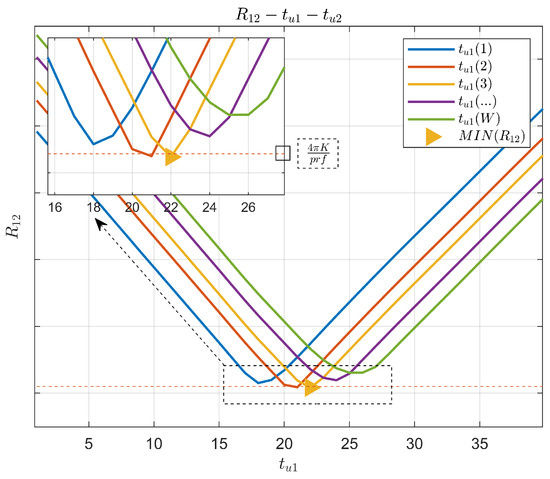 In the matrix , is the smallest element satisfying Equation (15), i and j are the row index and column index, respectively, and and are the real positions of and . For the sake of understanding, Figure 7 shows the typical relationship of between and . We can find the minimum value of in curve , whose is 22, and its value satisfies Equation (15), so here i is 22 and j is 3. If there is no element satisfying Equation (15) in , it means that the range W is too small, and W and the traversal step size can be increased appropriately.