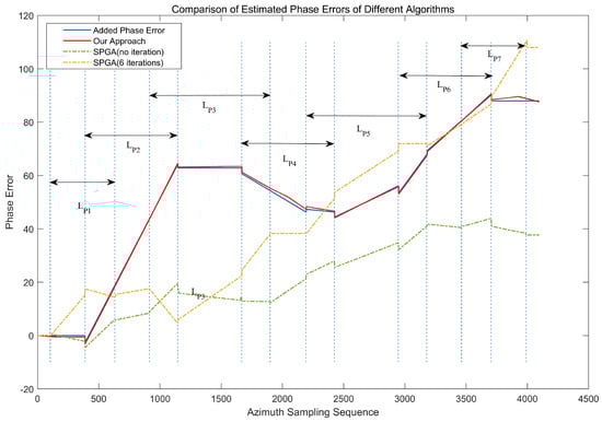 to were the synthetic aperture lengths of points 1 to 7, making the point targets offset by different pixel points, respectively, (see the first row of Table 1). The synthetic aperture of two adjacent main points overlap. It is worth noting that the piecewise linear function is not a linear function, and there are still higher-order components after the Legendre Polynomial Expansion. It will not only bring the drift of the point but also bring the defocusing effect of the point target. The piecewise linear phase error is a relatively extreme case, just to verify the superiority of the algorithm in the processing of linear components in this paper. In Figure 8, the green dotted line is the phase error estimated by SPGA without iteration, whereas the yellow dotted line is the phase error estimated by SPGA after six iterations. The reason why we choose six iterations as the reference object is that under general circumstances [7], six iterations can generally bring good results. It can be seen that the estimated phase error curve is quite different from the added curve, because SPGA cannot estimate the target position of the real point. On the contrary, the red solid line is the phase error extracted by our approach, which can better fit with the added phase error.