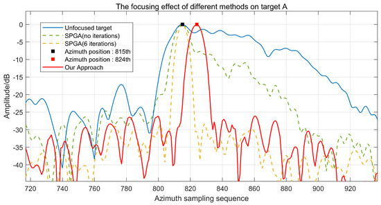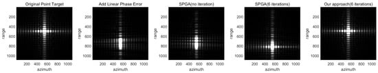 Figure 9 illustrates the effects of a representative point target before and after recovery. It can be seen that the traditional SPGA did not estimate the piecewise linear phase error of the point without iteration; not only did it not return the point target to the original position, but it even failed to achieve the focusing effect. After six iterations, although it achieved the focusing effect, it did not restore the original position. In fact, in more cases, it still failed to achieve the focusing effect after multiple iterations. See Table 2 for details. However, the algorithm in this paper not only makes the point target focus but also restores the point target to the original position without iteration. Figure 10 shows the azimuthal slice, and Table 3 shows the comparison of specific indicators. It can be seen that the proposed method can better estimate the added linear error.