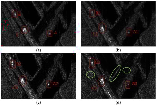 Figure 11a is the imaging results of an area after working with the working parameters shown in the table above (Caesar window with added). As shown in Figure 11a, after motion compensation, due to the existence of azimuth residual phase error, point target A, point target B, and area C have defocus and offset to different degrees, and area C is between A and B in the azimuthal direction. A and B are selected as reference point targets. Since the point targets in region C are too dense and the available point targets in this scene are sparse, the phase compensation of region C can only depend on the part where the phase errors of point A and point B overlap.