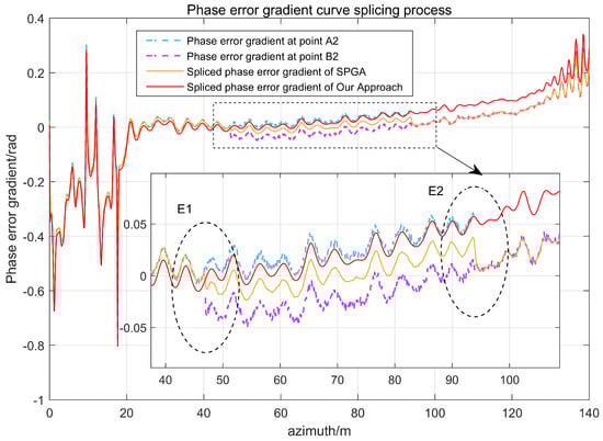 As can be seen from Figure 11, the green dotted line and yellow dotted line are the results of SPGA iterations of different times. With the increase in iterations, the peak sidelobe ratio and integral sidelobe ratio both increase significantly. However, due to the limitations of the algorithm itself, the position of the point target cannot be estimated, and the linear phase component cannot be extracted. Therefore, the position of the peak point hardly changes, and only changes the main lobe width, side lobe peak, and other indicators of the point target. Figure 12 reveals the state of the SPGA algorithm before and after splicing and the difference between the phase error obtained by the algorithm in this paper after splicing. The light blue dashed line is the phase error gradient extracted from point A, and the light purple dashed line 2 is the phase error extracted from point B. After being superimposed and filtered, the two lines are yellow solid lines (the mean value of the overlapped part is taken). As shown in Figure 12, the black dashed ellipse E1 and E2 shows that incoherence occurs when the two points are spliced due to errors in the selection of points A and B. Meanwhile, the red solid line in the figure is the phase error gradient curve of the algorithm splicing in this paper. It can be seen that there is a reservation of linear phase error and no incoherent linearity is generated during splicing.