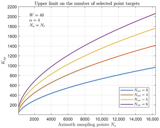 Figure 15 shows how the upper limit of the number of selected points changes with the direction of sampling points . That is, when the azimuth sampling point of the SAR image is , and the sampling point K exceeds the upper limit , the computational cost of our approach is equivalent to that of traditional SPGA with times of iterations. At the same time, through experiments, it is found that the above curve is not sensitive to W and in a certain range, so let it be an empirical value. In order to calculate quickly, change “>” in Equation (24) to “=” and simplify appropriately, and the following empirical formula is given: