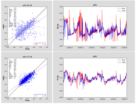 Upper plots: scatter plots and associated statistics for , . Lower plot: April time series of and radar swell and wind–sea .