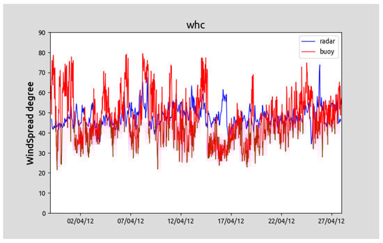 Wind direction is also included. The SV estimates this based on [35]. This gives a wind direction and directional spread factor. The latter, expressed as directional spreading in degrees, is compared with the average buoy directional spread factor over three frequencies about the Bragg frequency in Figure 6. The buoy data were noisier; the ranges were similar, but the details were different. The relationship between this measure of spread, , to the s used in [28] was . The mean values in April found were 47.48 for the buoy and 46.98 for the radar corresponding to s values of 1.41 and 1.44 with ranges of 0.44–4.65 and 0.55–2.53, respectively. AlA assumed a constant value of 2.