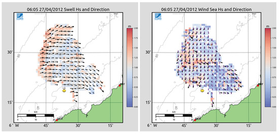 Maps showing swell and wind–sea components separately are presented in Figure 12. Plotting these maps made it clear that the 5 dB second-order signal-to-noise criterion, whilst not having a huge impact on accuracy at the buoy location, introduced noise in the radar measurements at longer ranges. A 12 dB criterion was used for the mapping, as it was found to get rid of most of the long-range noise. During the period of these maps (and commonly at this location), swell is predominantly from the southwest, refracting towards the coast in the shallower waters. Wind–sea is similar in wave height coming from the north. Variations in spatial coverage with time are clear and are characteristic of HF radar measurements, particularly of waves due to the sensitivity of the second-order spectrum to noise and the interference of different kinds. Gaps in the coverage indicate locations where waves were not measurable (radar data failed the quality criteria) or for the same reasons referred to above.