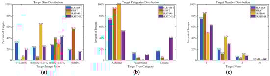 Figure 2. Statistical properties of SLR-IRST. (a) Statistical properties of target quantity distribution. (b) Statistical properties of target class distribution. (c) Statistical properties of target size distribution. - More balanced distribution of data categories: Figure 2b shows the statistical distribution of targets in different datasets against the real categories. The distribution of target categories in the SLR-IRST dataset is more balanced. The sample size of the waterborne targets was expanded from 87 (8.7%) in IRSTD-1k to 313 (11.3%) in SLR-IRST, which is a nearly three-fold increase. This greatly alleviates the problem of sample scarcity in the waterborne target category.