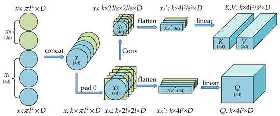 As shown in Figure 6, the feature sequence, x, is first restored to the form of a two-dimensional feature map along the spatial dimension. Since the region of interest is circular, when restoring along the spatial dimension, 0 is added around the circular region to make it square, and the feature map, , is obtained. The scaling operation is carried out in the spatial dimension through a layer of convolution. Let the scaling reduction factor be s—that is, the kernel size and step size of the convolution are both s. The feature map, , is obtained by scaling down the feature map, xK. The feature sequence, , , is obtained by flattening xK, xs along the spatial dimension. The keyword (K) and the value (V) are generated from the scaled feature sequence, , through two sets of linear projections. The query (Q) is generated from the unscaled feature sequence, , through a set of linear projections.