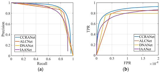 In order to comprehensively measure the pixel-level prediction ability of different deep learning methods, here the PR curve and ROC curve of the CCRANet and the other three methods (see Figure 8) were plotted. As seen in Figure 8, the CCRANet PR curve can cover the PR curve of other methods. This shows that the CCRANet’s prediction accuracy is stronger for positive samples (i.e., the pixels corresponding to the target region in the image). After the ROC curve stabilized, the recall metric of CCRANet is better, and it is always better than the other networks under different false-alarm rates.