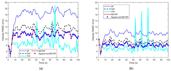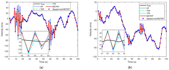 By analyzing the results given in Table 4, we can explore the numerical behavior of each filter when the ill-conditioned problem grows. Specifically, when , both two filters perform well, and have the same RMSE results. This further indicates that the square-root MCTKF is algebraically equivalent to the conventional MCTKF. With the decrease in the parameter , the RMSE results of the two filtering algorithms are no longer the same. Smaller RMSE results indicate that the square-root MCTKF is more numerically stable than the MCTKF. In particular, when and , the MCTKF diverges, but its square-root form still performs well. In addition, taking into account the computational complexity, the averaged CPU time of the square-root MCTKF is about of that of the MCTKF.