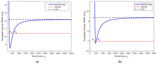 Choosing (10) for results in the parameter being a constant, i.e., . According to the results in Section 5.1, although this strategy in general cannot obtain the optimal value for , it still makes the MCTKF able to outperform the TKF in dealing non-Gaussian noise. Furthermore, in this condition, the MCTKF outperforms an MCTKF with a fixed kernel size , when the parameter is inappropriately selected. To sum up, the kernel size plays a very important role in the MCTKF, and (10) is a fair competitive strategy at present. We will study this problem in our future research.