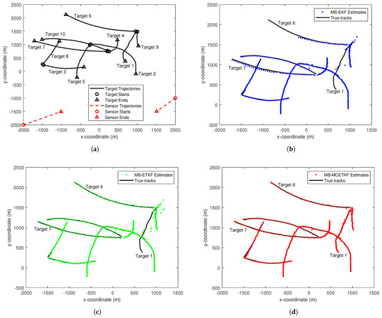 The true trajectories of targets and sensors in a single trial are shown in Figure 4a. The estimated results of target states by the MB-EKF, the MB-ETKF, and the MB-MCETKF are given in Figure 4b–d, respectively. Intuitively, The MB-EKF and the MB-ETKF perform poorly because some targets are lost during the tracking process, such as target 1 and target 6 in Figure 4b, and target 1 in Figure 4c. The main reason for this is that both are derived using the MMSE criterion under the assumption of Gaussian noise, and the MMSE only uses the second-order term of the innovation. They easily mistake outliers originated from targets as false-alarm targets, resulting in target loss. Moreover, several false-alarm estimations appear in Figure 4b,c. The main reason for this may be that the measurement outliers near the target state can easily make the target state estimation worse, although both filters have a certain robustness toward measurement outliers. In terms of details, a significant estimation bias gradually appears over time in both target 6 and 7 shown in Figure 4b. The main reason for this is that the MB-EKF does not consider the turning rate of a target, which is time-varying over time. The proposed MB-MCETKF shows better estimation performance than the other two filters, does not suffer from target loss and false alarms, and can accurately estimate the states of each target. The main reasons for this include: first, the TMC model is more accurate and takes into account the turning rate of a target via an auxiliary variable; and second, the proposed algorithm adopts the correntropy criterion, instead of the MMSE criterion, and shows better robustness toward outliers by utilizing higher-order information of the innovation.