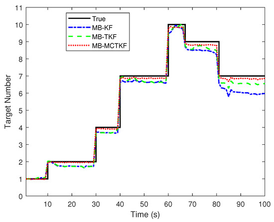 Figure 5 shows target number estimation results of different filters over 500 Monte Carlo trials. Figure 5 shows that the target number estimation of the MB-ETKF is almost same as that of the MB-EKF in the initial state, but worse than that of the MB-MCETKF. The main reason for this is that both are derived using the MMSE criterion under an assumption of Gaussian noise, and the MMSE only uses the second-order term of the innovation. They easily mistake outliers as false-alarm targets, resulting in an underestimation of target number. As time goes by, the target number estimation of the MB-EKF becomes worse than that of the MB-ETKF. The main reason for this is that the turning rate is not considered in the MB-EKF, resulting in a more inaccurate predicted state of a target, which will further reduce its robustness toward outliers. The target number estimation of the MB-MCETKF is more accurate than that of the other two filters, mainly because the former is derived by using correntropy criteria, which utilizes not only second-order but also higher-order information of the innovation, and thus, has stronger resistance toward outliers than the other two filters. Note that the MB-MCETKF can only reduce the influence of outliers to a certain extent, but cannot completely eliminate it. Therefore, large outliers may also be regarded as false alarms, resulting in an estimate of the number of targets slightly lower than the true number of targets.