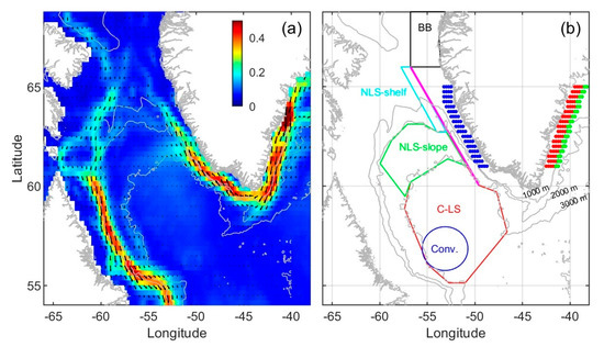 22. Cuny, J.; Rhines, P.B.; Niiler, P.P.; Bacon, S. Labrador Sea boundary currents and the fate of the Irminger Sea Water. J. Phys. Oceanogr. 2002, 32, 627–647. [Google Scholar] [CrossRef]