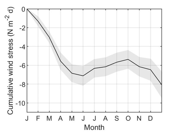 Winds were obtained from the Cross-Calibrated Multi-Platform (CCMP) version 3.0 product, which is a combination of ocean surface wind retrievals from multiple types of satellite microwave sensors and a background field (ERA5) from reanalysis [40]. The product is available on a 0.25° grid with a temporal resolution of 6 h. Cumulative alongshelf wind stress [41] averaged within 100 km from the coast off southwest Greenland between 61 and 65°N was computed to characterize average wind conditions in the region (Figure 2). Decreases or increases in cumulative wind stress off southwest Greenland indicate predominantly upwelling- or downwelling-favorable winds, respectively [29,31].