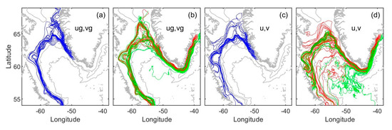 Figure 3. Examples of virtual drifter trajectories released on 27 August 2008 off (a,c) southwest (blue) and (b,d) southeast Greenland (coastal in red, offshore in green) using (a,b) only the geostrophic component of the flow (ug, vg) or (c,d) total velocities including the wind-driven term (u, v). The 1000, 2000 and 3000 m isobaths are shown in gray.