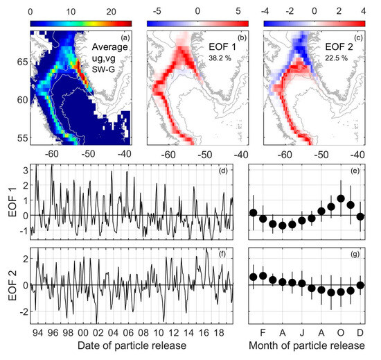 For particles released in coastal waters off southeast Greenland (red dots in Figure 1b), the average distribution of the frequency of observing particles at a given location when only geostrophic velocities are considered is consistent with transport in the Eastern and Western Greenland Currents (Figure 6a; [38]). Large values are observed in coastal waters off southeast and southwest Greenland and also around the 1000 m isobath circumnavigating the Labrador Sea. Once again, a large seasonal change in the distribution of particles is captured by EOF 1 just north and west of the 1000 m isobath (Figure 6b), representing an increase in the frequency for particles released during August to October and a decrease for those released during winter (Figure 6d,e). EOF1 values are slightly negative between the 2000 and 3000 m isobath, indicating increased transport in that region during winter (Figure 6e). Positive EOF 2 values are increased between the 1000 and 2000 m isobaths, with smaller negative values extending toward Baffin Bay (Figure 6c). The mode is not characterized by clear seasonal variability (Figure 6g) but instead by large pulses in different years (Figure 6f). When total velocities are considered (Figure 7a), the average distribution of particles released off coastal southeast Greenland in the Labrador Sea is similar to when only the geostrophic component is used, although the intensification around the 1000 m isobath is somewhat reduced (compare Figure 7a with Figure 6a). The first EOF mode captures the westward transport of particles released during summer (Figure 7e) to the north and west of the 1000 m isobath (areas in red Figure 7b). It also captures variability in the distribution of particles released in winter (Figure 7e) off coastal southeast Greenland that extends over a much larger area of the Labrador Sea, including into the interior of the basin (areas in blue in Figure 7b). EOF 2 is primarily characterized by large positive values between the 1000 and 2000 m isobaths (Figure 7c). Monthly averages of the amplitude time series for EOF 2 are generally not different from zero (Figure 7g), but several large events are observed throughout the years (Figure 7f). EOFs of the distribution of particles released farther offshore off southeast Greenland (particles in green in Figure 1b) reveal a picture consistent with that described for particles released near the coast (Figure 6 and Figure 7) but with increased EOF values extending farther into the interior of the basin.