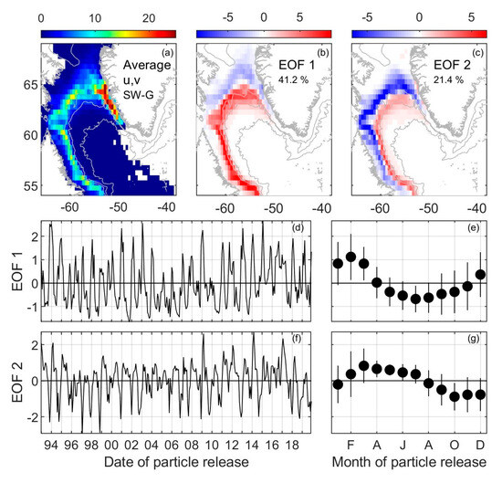 Figure 4. Heat maps showing distribution of particles released off southwest Greenland (SW−G) using only the geostrophic component of the velocity (ug, vg). (a) Average (%), (b) EOF 1 and (c) EOF 2, and amplitude time series for (d) EOF 1 and (f) EOF 2. Monthly averages of the amplitude time series for (e) EOF 1 and (g) EOF 2 are also shown. Amplitude time series indicate timing of particle release. Fraction of variance explained by EOFs 1 and 2 are shown in panels (b,c).