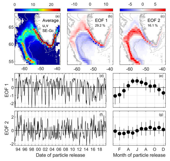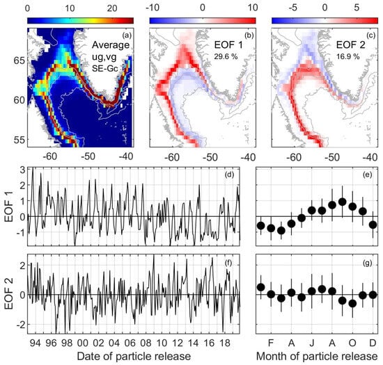 Figure 6. Heat maps showing distribution of particles released off southeast Greenland near the coast (SE−Gc) using only the geostrophic component of the velocity (ug, vg). (a) Average (%), (b) EOF 1 and (c) EOF 2, and amplitude time series for (d) EOF 1 and (f) EOF 2. Monthly averages of the amplitude time series for (e) EOF 1 and (g) EOF 2 are also shown. Amplitude time series indicate timing of particle release. Fraction of variance explained by EOFs 1 and 2 are shown in panels (b,c).