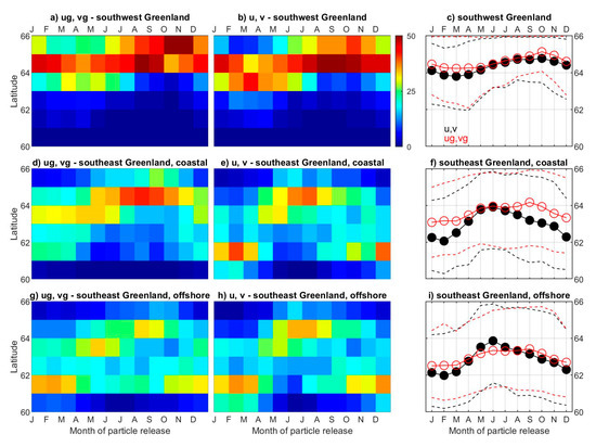 Figure 8. Histograms of latitude of westward displacement of particles across the magenta line shown in Figure 1b for particles released off (a,b) southwest Greenland, (d,e) coastal southeast Greenland, and (g,h) offshore southeast Greenland, using (a,d,g) only the geostrophic component of the flow or (b,e,h) total velocities including the wind-driven term. Only particles that move westward across the magenta line were considered, so that values in the various latitudinal bins for each month add to 100%. Time series of the weighted-averaged latitude of the westward movement for particles released in the three regions are shown in panels (c,f,i). Dashed lines show latitudinal band where 90% of the drifters moved westward across the magenta line (Figure 1b). In all cases, the x-axis indicates the timing of particle release.