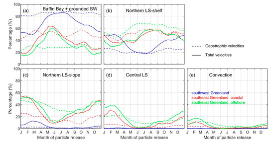 Figure 9. Time series of monthly averages of the percentage of particles released off southwest Greenland (blue) or southeast Greenland (near the coast in red, offshore in green) that reached each of the 5 regions shown in Figure 1b ((a)—Baffin Bay + grounded SW; (b)—northern Labrador Sea shelf; (c)—northern Labrador Sea slope; (d)—central Labrador Sea; (e)—convection region.). Percentages using total velocities are shown by solid lines, while dashed lines were computed when only the geostrophic component of the flow was used. In all cases, the x-axis indicates the timing of particle release.