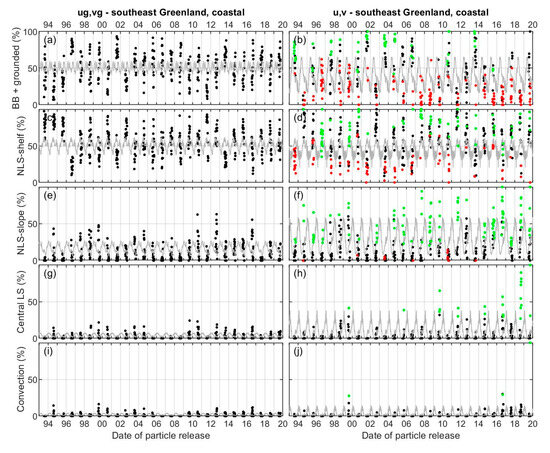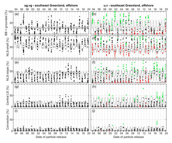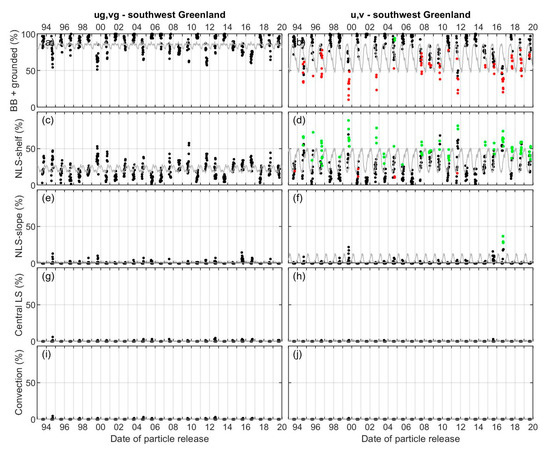 Figure 10. Time series of the percentage of particles released during the melting season off southwest Greenland that were transported into the 5 regions identified in Figure 1b ((a,b)—Baffin Bay + grounded SW; (c,d)—northern Labrador Sea shelf; (e,f)—northern Labrador Sea slope; (g,h)—central Labrador Sea; (i,j)—convection region) using (left) only the geostrophic component of the flow or (right) total velocities including the wind component. When only geostrophic velocities were used (i.e., left panels), the percentages for each year are shown by the small black dots. When total velocities were used (i.e., right panels), percentages are also shown by small black dots, except when the percentages are at least 20 percentage points smaller (red) or larger (green) than the percentage computed using only the geostrophic flow. Monthly averages over the entire year (from Figure 9) are shown in gray. In all cases, the x-axis indicates the timing of particle release.