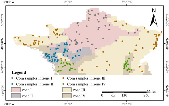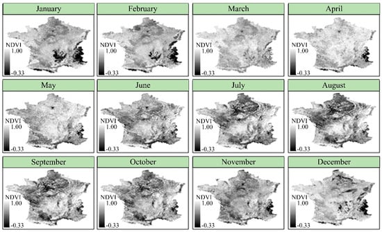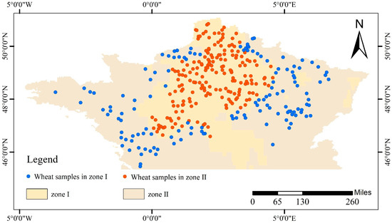 The sample dataset with crop types and geographical location information is derived from the 2009 European LUCAS dataset (Figure 1). Wheat and corn are the two main crops concentrated in northern France and are therefore used as the study crop types. For the study area, 325 wheat samples, 600 non-wheat samples, 213 corn samples, and 545 non-corn samples were obtained. The remote sensing data are obtained from the 2009 MODIS13Q1 product (Figure 2). The Savitzky–Golay smoothing filter is used to reduce noise and retain effective spectral information. The environmental data (topography, temperature, precipitation) are obtained from WorldClim [21] (https://www.worldclim.org/data/index.html (accessed on 29 November 2009)), where the monthly average image data are selected for climate and precipitation. The spatial resolution is 2.5 min (~12 km2).