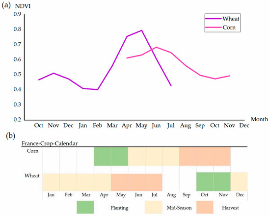 Phenology refers to the cyclical changes of crops in response to external environmental conditions. The varying phenological information and growth characteristics among crops are the key to their differentiation. The relevant phenological information on crops in the study area is obtained through a series of previous studies [22,23,24]. Figure 3 shows that the growth cycle of wheat is from October to July, and corn is from April to November. These months of the growth cycle must be included in the calculation of classification indexes.
