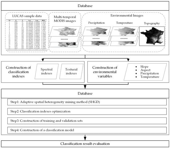 Spectral and textural indexes that can characterize crop features are discussed in Section 3.1. Environmental variables related to spatial heterogeneity are given in Section 3.2. The proposed ACCSH to classify crops is explained in Section 3.3. The classification evaluation indicators for assessing the classification effect are described in Section 3.4. The procedure is given in Figure 4.