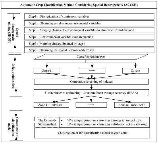 This study proposes ACCSH to automatically classify crops considering the spatial heterogeneity of crop growth characteristics under the influence of multiple environmental factors. Experiments on two real applications are carried out. Comprehensive comparisons are designed, including classifications at the global scale and based on non-optimized classification indexes. The proposed ACCSH has the following advantages: (1) The results of SHGD in ACCSH can reveal the spatial homogeneous zones and mechanism of crop growth characteristics under the influence of multiple environmental variables. (2) The index optimization strategy in ACCSH can fully consider the differences between spatial homogeneous zones by carrying out a separate optimization in each spatial homogeneous zone and obtaining the key classification indexes to improve classification accuracy. (3) ACCSH can automatically perform crop classification without sufficient prior knowledge of the study area.