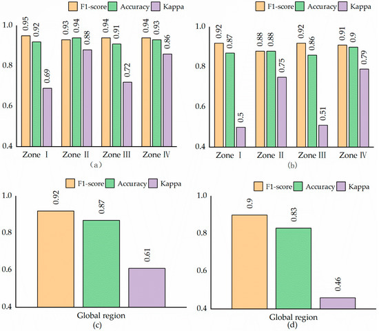 Figure 11 presents the classification evaluation indicators of corn. Results show that the F1 scores and accuracy indicators of ACCSH in zones I–IV are all higher than 0.9, verifying its effective crop classification ability with high accuracy in a large-scale region with significant spatial heterogeneity.