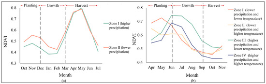 Growth characteristics of wheat and corn under different spatial homogeneous zones. (a) is the mean NDVI of wheat during the phenological period in each spatial homogeneous zone, and (b) is the mean NDVI of corn during the phenological period in each spatial homogeneous zone.