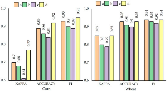 The Kennard–Stone (KS) algorithm can effectively select the training and validation sets with sufficient regional representation of classification indexes and was adopted in this study [46]. Among the sample crops, 70% were chosen as the training set, and the remaining 30% were utilized as the validation set [47]. The classification performance was eventually evaluated using the kappa coefficient, F1 score, and accuracy, which are commonly used and verified to be effective [48]. The F1 score is aimed at dichotomies and reflects the classification effect of target-type crops, which is the harmonic value of recall and precision. Additionally, accuracy signifies the percentage of the correctly predicted rate of the whole sample [49]. The kappa coefficient is a comprehensive index to evaluate the classification performance of the model as a whole.