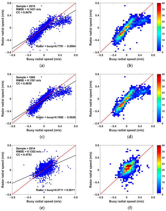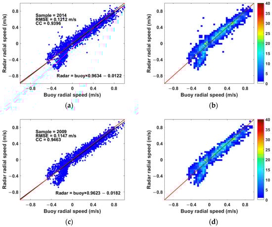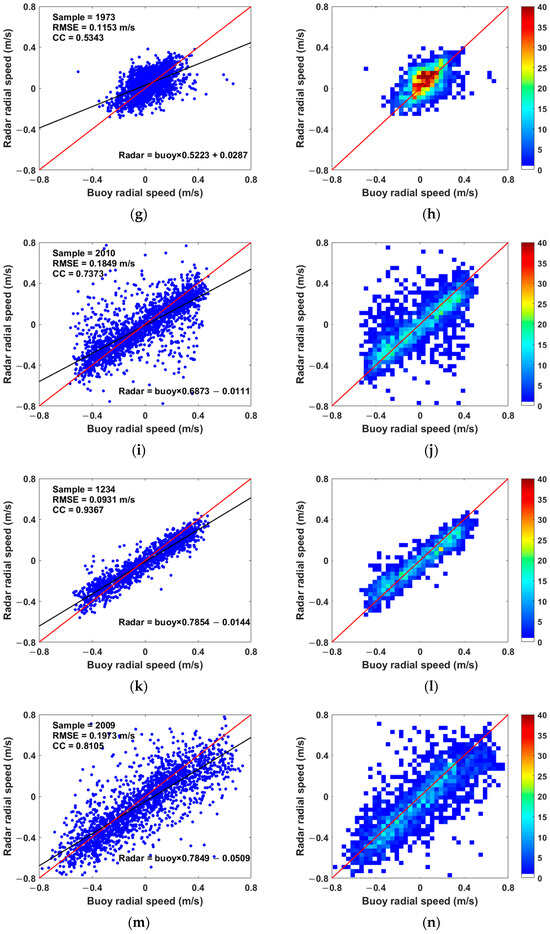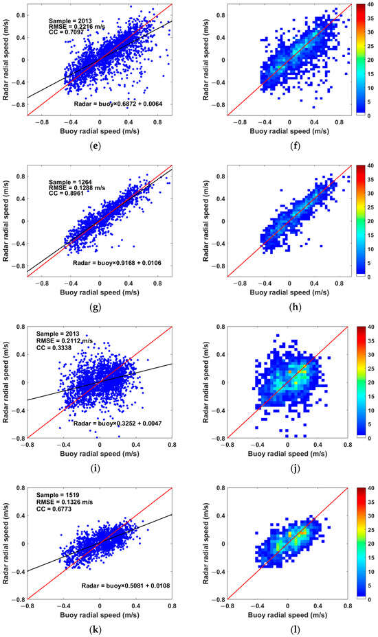 Figure 11 and Figure 12 show the scatter plots of the radial current. The plots include the linear fit line (black line) and ideal relationship (red line) between radar and buoy data, as well as the frequency of different current speeds. The results demonstrate that the radar current result is generally consistent with the buoy data, with slightly less accuracy observed at buoy B for SHLI and buoy E for XIAN due to the small magnitudes of radial current speed. After QC, the radar radial current results and buoy data are more consistent.
