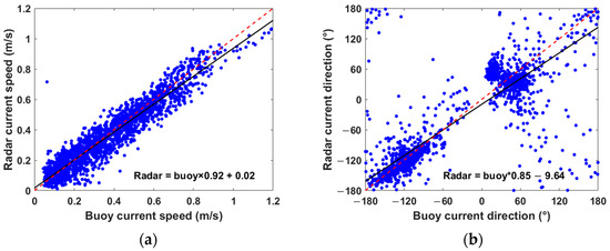 Figure 15 displays the scatter plots of the current speed and directions after QC. In the plots, the red line represents the ideal relationship, while the black line represents the linear fit. As can be seen, the consistency between the radar-derived current speed and buoy data at point A is the best, while the consistency for point B, point D, and point E is slightly poor. The radar-derived currents are mainly concentrated in two directions, i.e., −120° and 60°, differing by 180°, which is a typical tidal current feature.