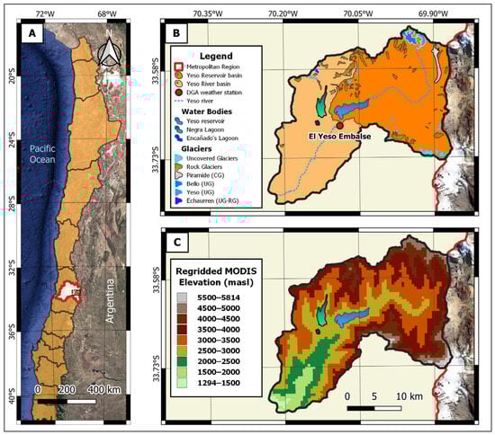 Map of the Yeso River basin. (A) Location of the Yeso River basin (YRB) in Chile and South America. (B) Boundaries of the YRB and Yeso Reservoir (YReB) basins, including a meteorological station (“El Yeso Embalse”), two lagoons, Yeso reservoir, and glaciers which are defined as covered glaciers, uncovered glaciers, and rock glaciers in IPG 2014. (C) Regridded MODIS Elevations of the YRB.