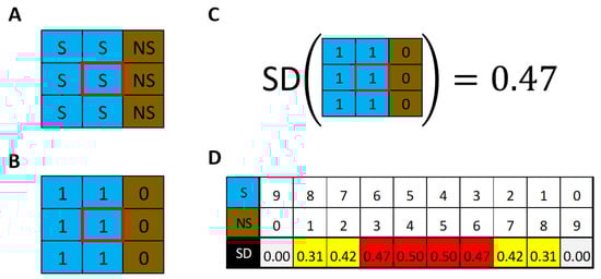 Snow pixels and boundary pixels classification (A) Distribution example of nine pixels with S (cyan) and NS (brown). The red box corresponds to the central pixel. (B) The same as before, but with binaries values (S = 1, NS = 0). (C) Standard deviation (SD) of 9 pixels example. The SD value is assigned to the central pixel. (D) The table displays how variations in the number of pixels of S and NS (first and second row) correspond to changes in SD (third row). The SD threshold considered for boundary pixels is 0.47 (red, 6S-3NS, and 5S-4NS configurations or vice versa). The other configurations represent the near boundary pixels (0 < SD < 0.47; yellow) and full similarity (grey, SD = 0).