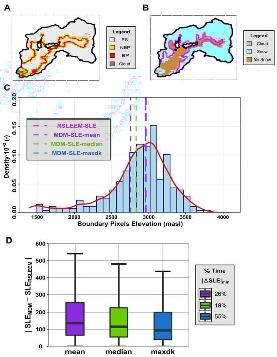 This process is repeated for all pixels in the basin, obtaining SD and classifying them as boundary pixels (BP), near boundary pixels (NBP), full similarity (FS), or cloud (Figure 3A). The elevation of the boundary pixels is extracted from the regridded DEM considering the abovementioned conditions. We defined the representative SLE of the basin based on statistical metrics of the SLE distribution of the boundary pixels, such as the mean, median, and maximum of the kernel density estimation (maxdk, Figure 3C). To identify which statistical metric best represents the SLE obtained using MDM, we compare these metrics with the SLE obtained using the Regional Snowline Elevation Estimation Method (RSLEEM) []. The RSLEEM consists of obtaining the SLE that minimizes the function , which represents the sum of the percentage of NS pixels above the SLE and the percentage of S pixels below the SLE.