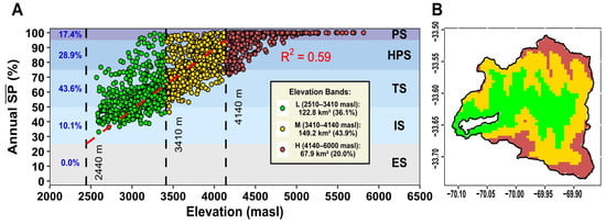 As expected, Figure 4 shows the SP increases with the elevation, meaning the snow lasts longer due to the temperature reduction with the altitude. The zones IS, TS, and HPS, which together represent 82.6% of the basin area (280.8 km2), present a linear behavior (R2 = 0.59), revealing that snow persists, on average, between 91 and 346 days‧year−1, with a positive trend of 4.1%‧10−2‧m−1. This trend implies that snow lasts an additional 15 days per each increase of 100 m in elevation. Also, almost half of the basin (43.8%) corresponds to TS (3000–4000 m), suggesting that most snow lasts between 183 and 274 days‧year−1. Only 18.4% of the basin area (59.1 km2) presents an annual > 95% (PS), which is the zone where the snow lasts more than 11 months. The snow cover exhibits a = 100% above 4000 masl, which is associated to the presence of glaciers. We noted that two pixels at the same elevation may have different values due to factors related to the topography and snow transport processes, such as the orientation of slopes, slope gradient, and wind transport []. Lastly, we defined elevation bands in the basin that correspond to elevation levels associated with SP = 25%, 65%, and 95% based on the linear regression (Figure 4A). Then, we categorized these bands as low elevation (L; [2510 masl–3410 masl]), medium elevation (M; [3410 masl–4140 masl]), and high elevation band (H; [4140 masl–6000 masl]), to study spatiotemporal changes in snow cover area. The lowest elevation for the L band is defined according to the lowest elevation of the YReB.