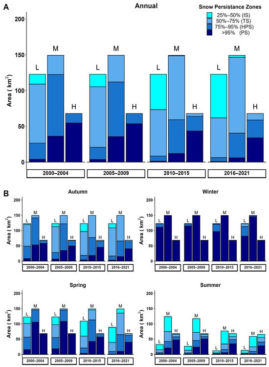 Evolution of snow area and persistence. Annual (A) and seasonal (B) change in mean area and SP in the Yeso Reservoir basin for four subperiods between 2000 and 2022. Bars indicate the mean area of each elevation band (L, M, and H). Colors in the bars indicate the mean area corresponding to each SPZ. The ES range was not included.