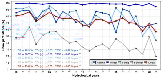 During the study period, the average SP in the Yeso Reservoir basin shows a significant decreasing trend at the seasonal and annual time scales at basin scale (Figure 6). At the annual scale, SP values decrease from 80.7% to 56.7% with a negative TSSE of 0.80%‧year−1, which implies 2.9 fewer days of snow each year (FDOS). At the seasonal scale, SP values are similar to the annual scale for autumn, with a decreasing TSSE of 0.62%‧year−1 (0.6 FDOS). The winter season shows a stable behavior in SP with values between 94.6 and 99.9% and a minor decreasing trend of 0.08%‧year−1 (0.1 FDOS). Spring and summer are the most affected seasons, with negative trends of 1.41%‧year−1 and 1.33%‧year−1 (1.4 and 1.2 FDOS), and SP values varying between 44.0 and 95.9% and between 19.6 and 64.2%, respectively. As expected, winter presents the greatest snow persistence, with an = 98.7%, whereas the summer presents the lowest SP values, with = 40.7%. While the autumn and spring show similar values ( = 78.3% and 77.8%), the spring tends to present larger persistence than autumn for some years. In addition, before 2010 (before the MD), spring showed more persistence than autumn for most years because of the wet period (high precipitation in the cold season, Figure A8, Appendix A), which results in large amounts of snow accumulating at the beginning of spring. There are only two years, 2004 and 2007, where spring presents lower persistence than autumn, which is explained by the fact that these are the driest years of the period. After 2010 (the beginning of MD), autumn SP is persistently greater than that of spring, as this is a period marked by a dry season with severe precipitation deficits in the cold season, which causes a reduction in the amount of snow available for melting in spring. However, the behavior was different in 2011, 2015, and 2018, which could be explained by lower precipitation in autumn (below 150 mm) than in winter (Figure A8, Appendix A), except for 2019 and 2021, the driest years. For example, in 2015, a year influenced by El Niño conditions [], there was no precipitation in autumn, and snowfall was concentrated in winter and spring. These findings lead to the conclusion that the amount and frequency of precipitation in the cold season controls the available snow for the dry season and, therefore, the available freshwater derived from the snow melting.