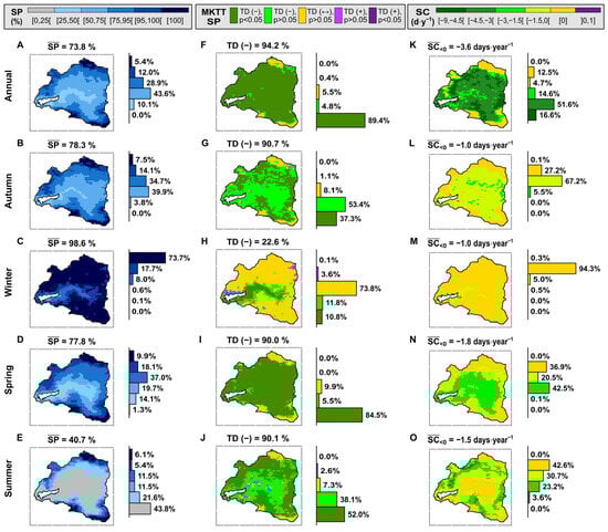 Snow persistence trends in the Yeso Reservoir basin for the entire study period. (A–E) Mean annual SP () for 22 hydrological years (2000–2021). Annually in the first row and each season from the second to fifth rows. (F–J) MKTT SP per year and season for the entire study period. (K–O) SP but as a change in the number of days per year (season) and per pixel (SC, snow change). The value above each graph represents the mean SP for 22 hydrological years at basin scale (first column), the percentage of the area with a negative trend (p < 0.05 and p > 0.05) in SP (second column), and the mean of negative snow change values in the basin (third column). To the right of each graph, there is a histogram that summarizes the percentage of the basin area used by each variable (, MKTT SP, and SC). The close brackets ([]) denote that endpoints are included in the set, while open brackets (] [) indicate the exclusion of them.